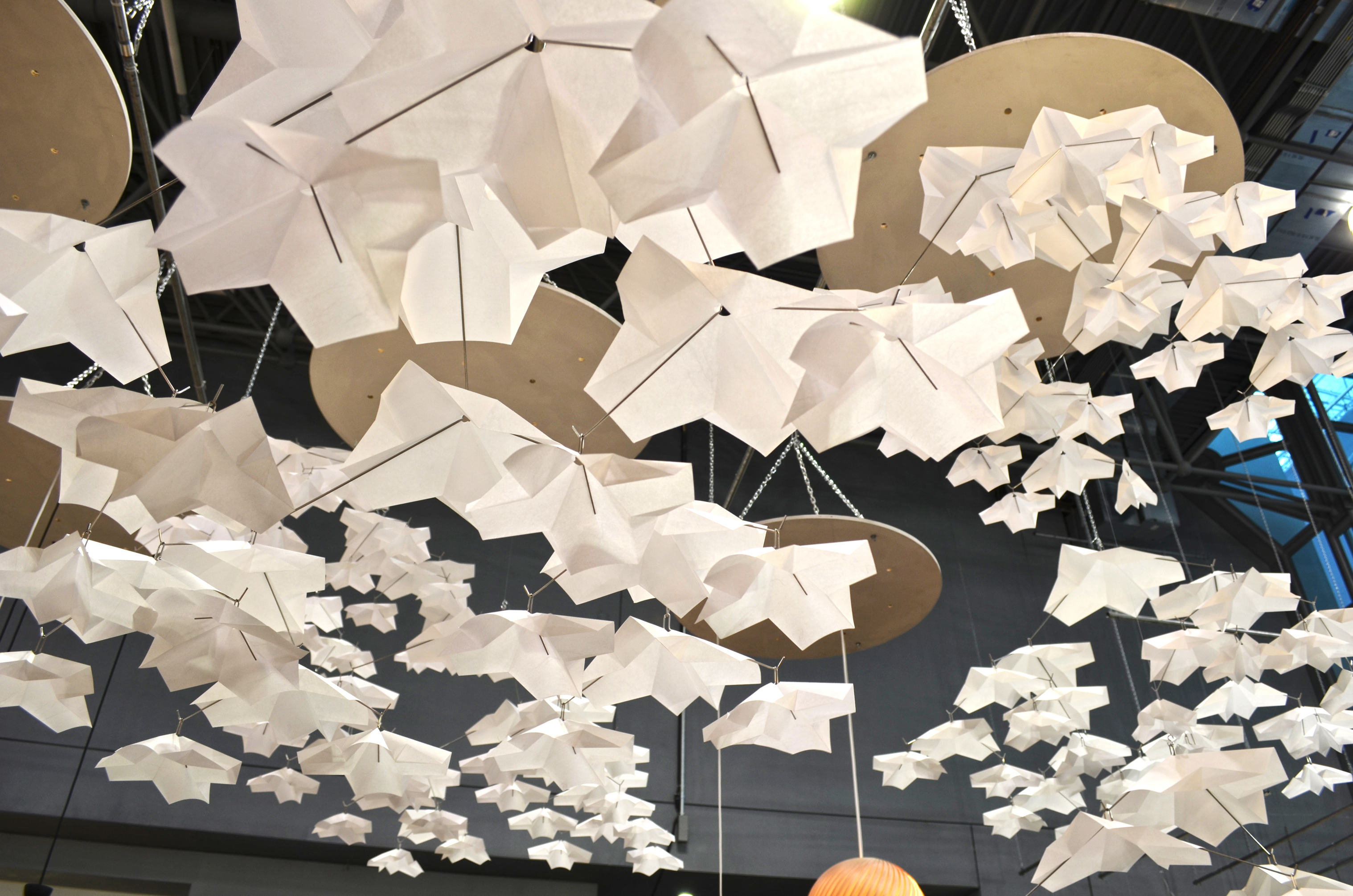 Minoshi Garden is an interpretation of the mysterious spirit of Japanese landscapes. Akin to the light and shadow play of screens in Japanese houses, the translucent nature of multiple geometric origami elements project serenity and a dynamic addition to any space.
